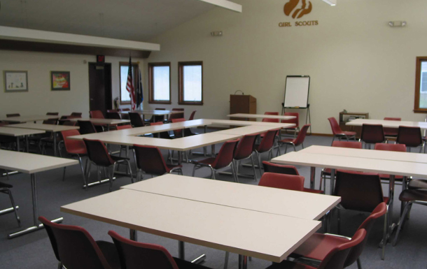 The conference room at the Girl Scout Center in Sheboygan is perfect for meetings, presentations, showers, reunions, parties, and more. The conference room holds 99 people. There are plenty of tables and chairs that can be arranged and moved as needed. There is access to a full kitchen if needed. Learn more about renting the conference room, or our other rentable buildings, in our rental guide!