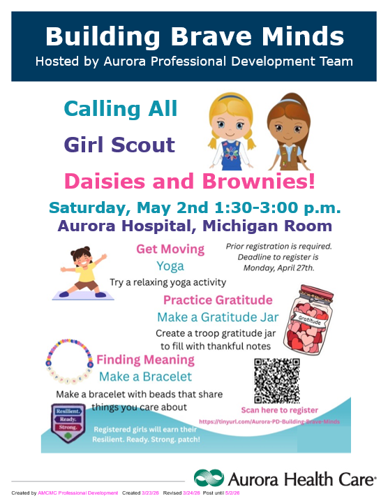 The nurses at Aurora Medical Center in Two Rivers are excited to host a special event for Daisy and Brownie Girl Scouts. Their focus is on promoting mental health and wellness at a young age. Girls who participate will earn the Resilient, Ready, Strong patch.