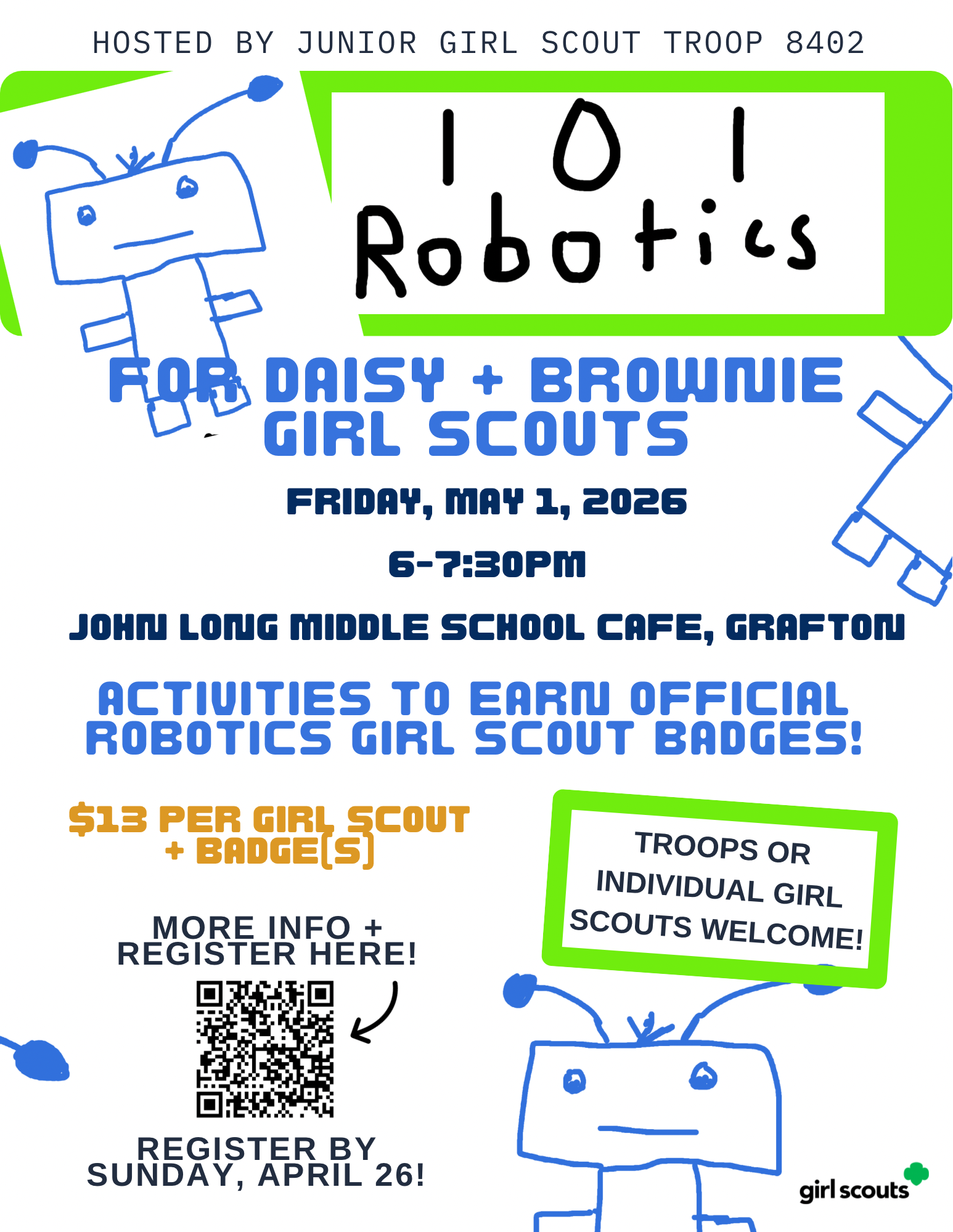 Pulling from their experiences working on their own Robotics badges in Fall 2025, Grafton's Kennedy Elementary School's 4th Grade Junior Girl Scouts (Troop 8402), will offer guided, station-based robotics activities. Participating Girl Scouts will rotate across the several stations in small groups.